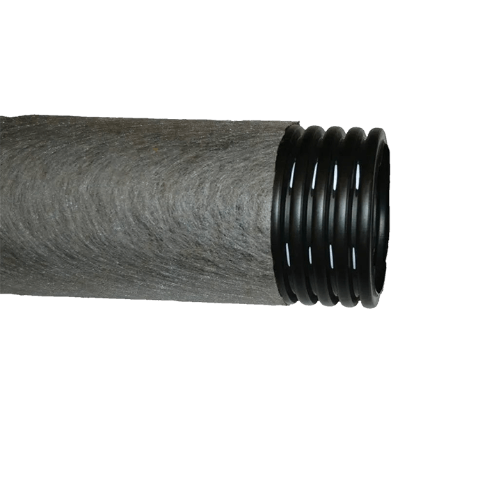 Геотекстильный фильтр плотностью 100–150 г/м² равномерно охватывает трубу по периметру и выполняет ключевую функцию: он пропускает воду, но задерживает песок, глину, мелкие частицы грунта и корни, предотвращая заиливание внутреннего канала. Это значительно увеличивает срок службы дренажной системы и снижает потребность в обслуживании. Фильтр изготовлен из устойчивого к гниению и биологическому разложению полипропилена или полиэстера, сохраняя свои свойства на протяжении десятилетий.