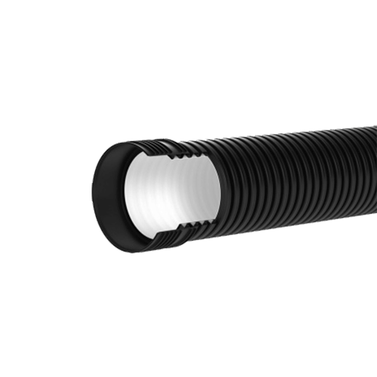 Трубы ПЭ раструбные гофрированные — это двухслойные трубы из полиэтилена низкого давления (ПНД), предназначенные для устройства наружных систем канализации, дренажа и ливневой канализации. Конструкция включает гладкую внутреннюю стенку и гофрированную внешнюю поверхность, что обеспечивает высокую кольцевую жёсткость, устойчивость к сжимающим нагрузкам грунта и при этом сохраняет гибкость для укладки на сложном рельефе. Наружная гофра распределяет нагрузку, а внутренняя гладкая поверхность способствует свободному прохождению стоков без застоя.